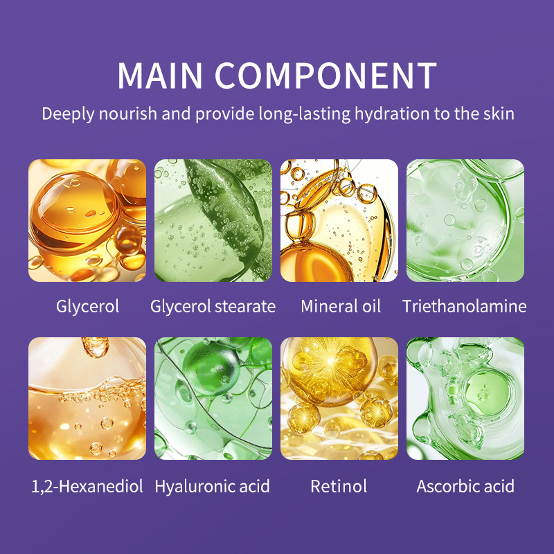 Vitamin C, Hyaluronic Acid, Retinol, Glycerol, Mineral OilFonctionnalité :